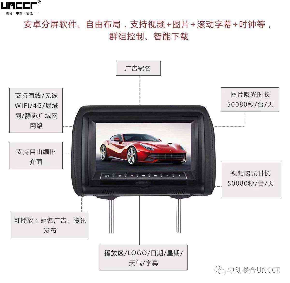 9寸头枕车载广告机功能展示: