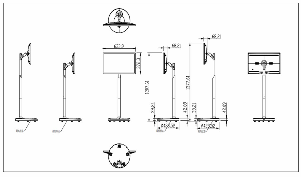 中创联合27英寸移动随心屏采用无前框设计,贴合全面钢化玻璃全面屏设计风格,内置大功率立体声喇叭带来沉浸式体验,背部热对流散热孔设计,屏体后壳一体话设计,支架支持旋转、前后倾一体化转轴,方便携带使用,最大170mm升降高度调节,设备自带大容量锂电池,持久续航,满足常规使用时间5小时,超静音万向脚轮,随心移动,支持1080p分辨率高清视觉,多种安卓方案,高亮度,高对比,支持最大10点电容触控点数,ag钢化玻璃可选,为你带来前所未有的体验。